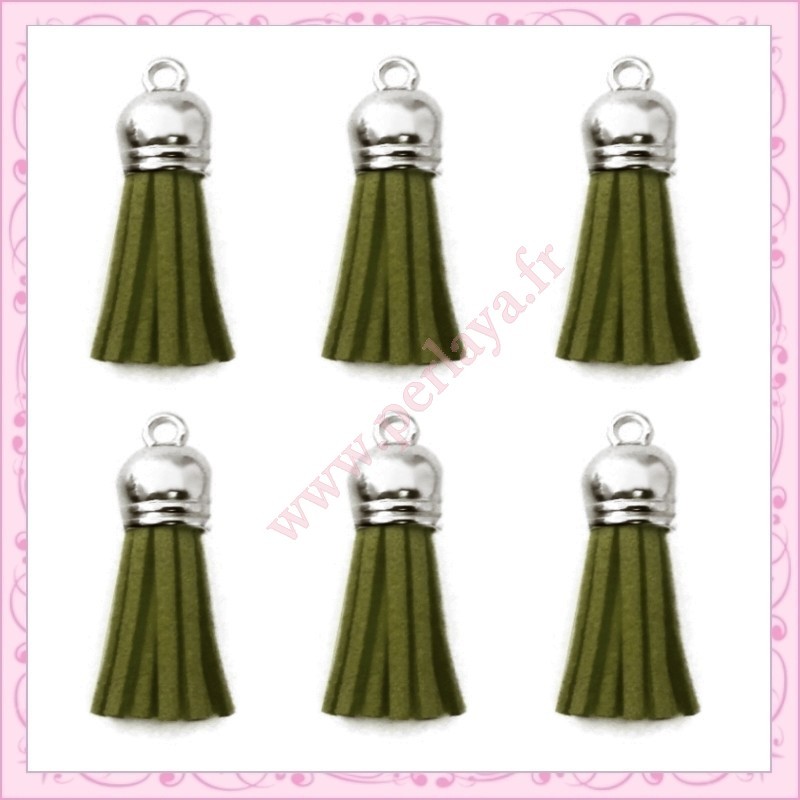 5 pompons 35mm vert olive style daim-suédine calotte argentée
